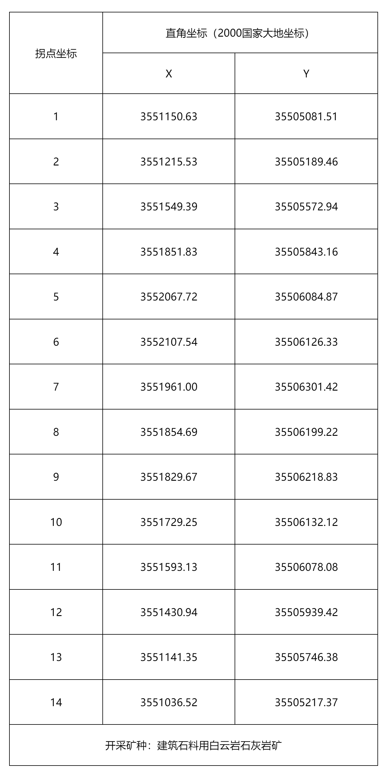 由14個拐點坐標(biāo)圈閉(見下表),礦區(qū)總面積:0.448平方公里,開采標(biāo)高:+1029m至+825m