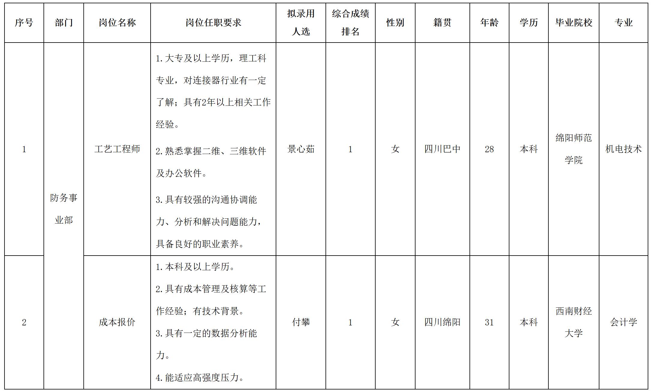 根據(jù)四川華豐科技股份有限公司發(fā)布的招聘公告及招聘相關(guān)規(guī)定,經(jīng)測(cè)試、考察、體檢等程序,擬錄用景心茹等同志到四川華豐科技股份有限公司工作,現(xiàn)予以公示,具體情況如下: