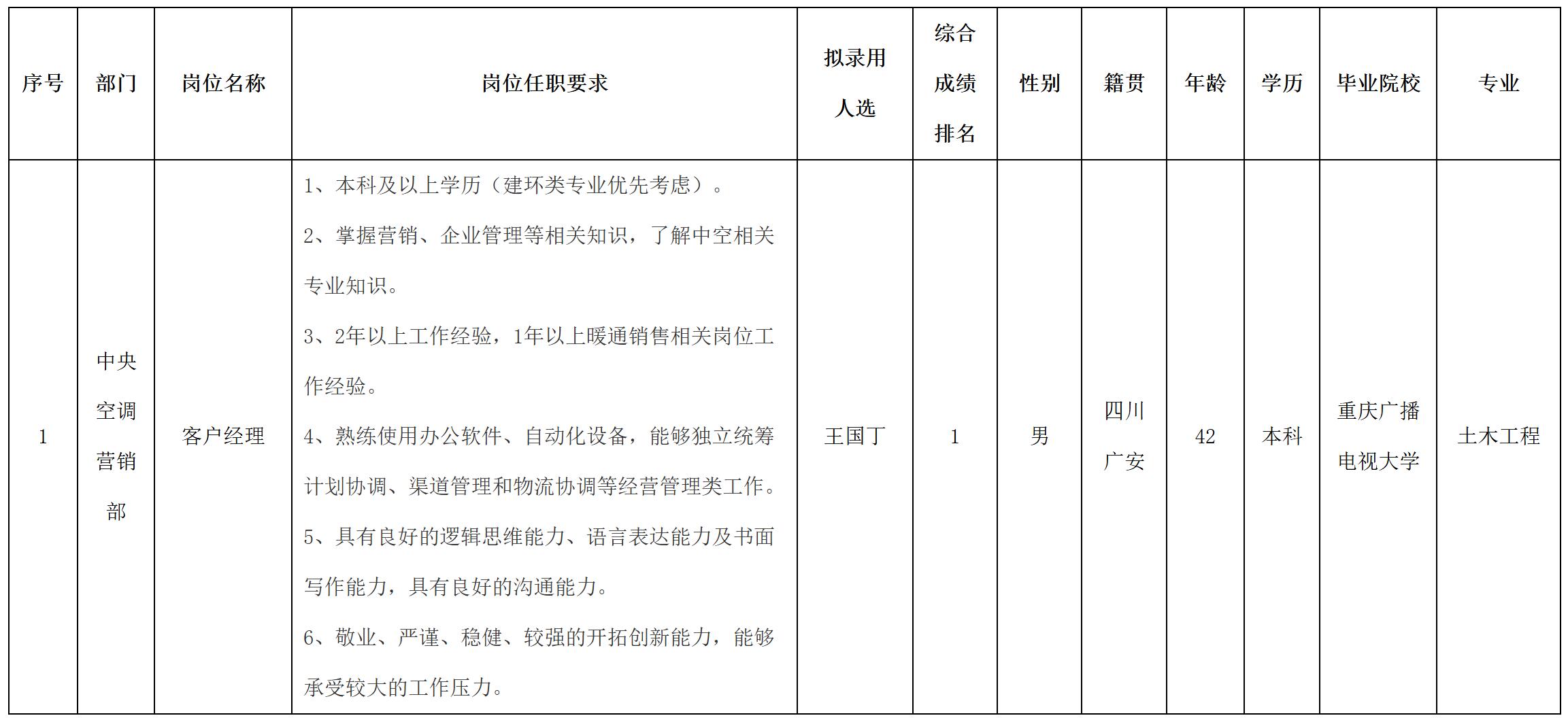 根據(jù)四川長虹空調(diào)有限公司發(fā)布的招聘公告及招聘相關(guān)規(guī)定,經(jīng)面試,擬錄用王國丁到長虹空調(diào)工作,現(xiàn)予以公示,具體情況如下: