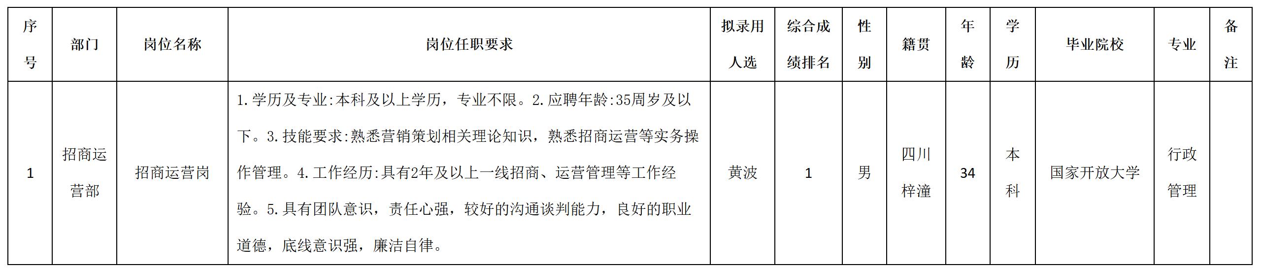 根據(jù)四川九洲千城商業(yè)管理有限公司發(fā)布的招聘公告及招聘相關(guān)規(guī)定,經(jīng)測試、考察、體檢等程序,擬錄用黃波同志到四川九洲千城商業(yè)管理有限公司工作,現(xiàn)予以公示,具體情況如下: