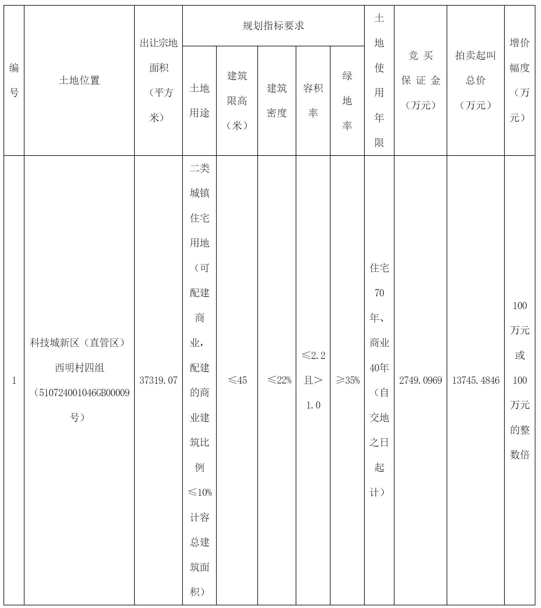 經(jīng)綿陽市人民政府批準(zhǔn),綿陽科技城新區(qū)管理委員會決定以拍賣方式出讓一宗國有建設(shè)用地使用權(quán),綿陽市公共資源交易服務(wù)中心具體組織實(shí)施本次拍賣出讓活動,現(xiàn)將有關(guān)事項(xiàng)公告如下: