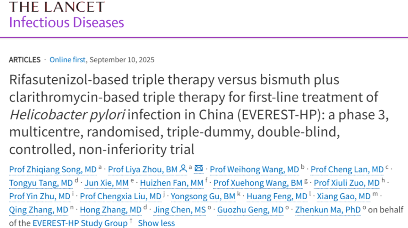 北京大學(xué)第三醫(yī)院消化科周麗雅/宋志強(qiáng)教授團(tuán)隊帶領(lǐng)全國40家醫(yī)療機(jī)構(gòu)消化疾病診療中心研究發(fā)現(xiàn),含利福特尼唑的三聯(lián)方案,讓幽門螺桿菌治療有望重新回歸更簡便的三聯(lián)方案時代,為全球幽門螺桿菌感染者帶來了全新的治療選擇。相關(guān)成果日前于《柳葉刀-感染病學(xué)》在線發(fā)表。[