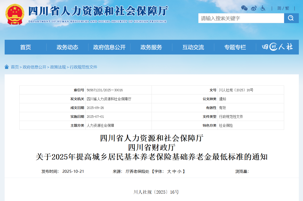 日前,四川省人力資源和社會(huì)保障廳、四川省財(cái)政廳發(fā)布關(guān)于2025年提高城鄉(xiāng)居民基本養(yǎng)老保險(xiǎn)基礎(chǔ)養(yǎng)老金最低標(biāo)準(zhǔn)的通知。[